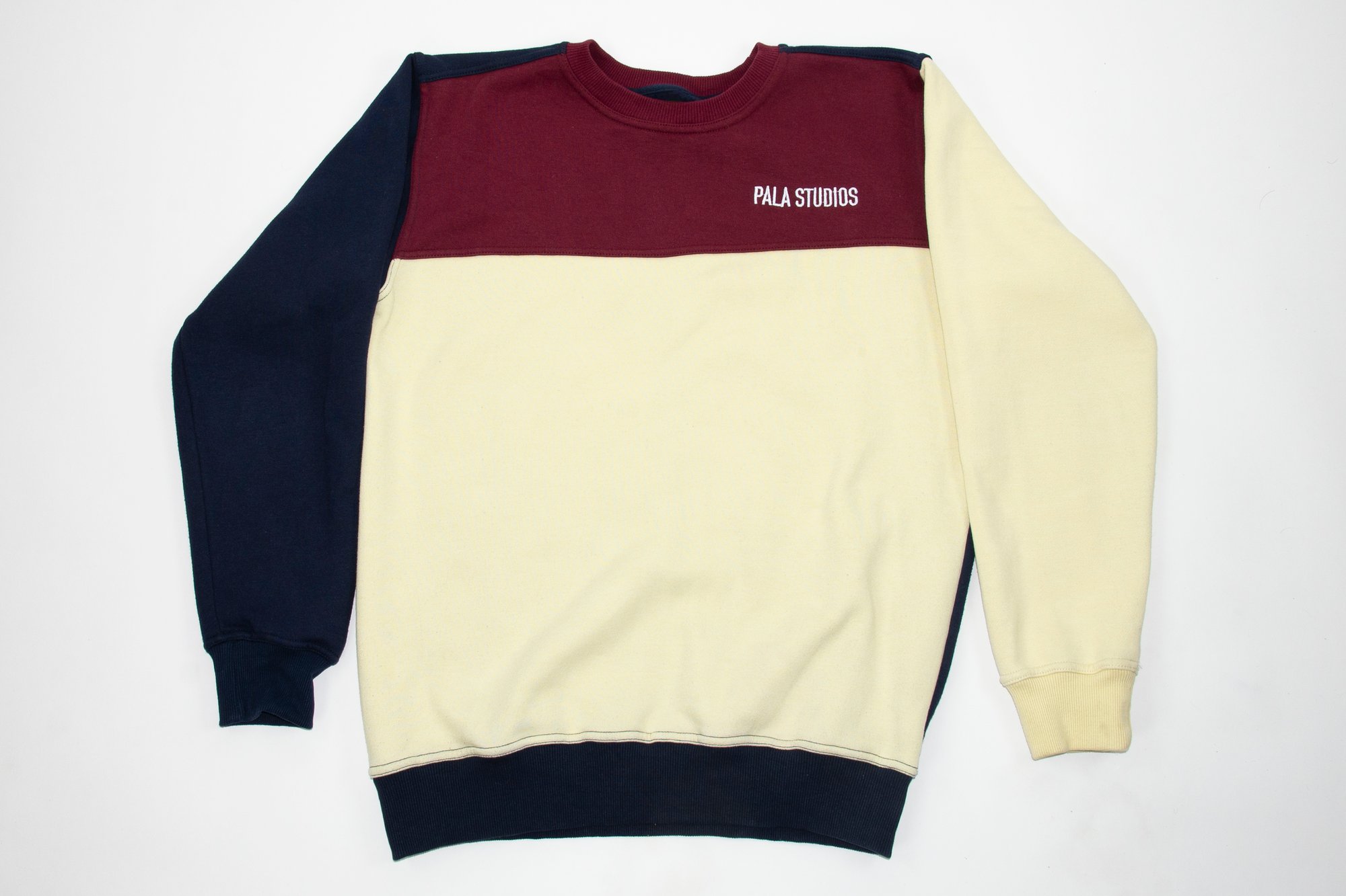 - Color-blocked crew (maroon/navy/creme) - 100% premium cotton - 'PALA STUDIOS' embroidery - Sewn 'P' logo on the sleeve